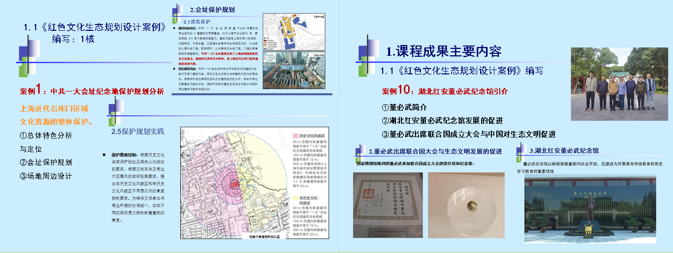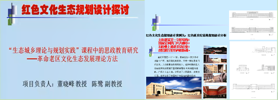 董晓峰教授通过对中共一大会址纪念地、井冈山革命根据地红色修学地、遵义红色修学路线、南梁革命纪念馆、延安革命纪念馆等红色研学实践基地的考察学习和相关规划设计的分析梳理,编写了一系列“红色文化生态规划设计案例”,提炼出红色研学纪念地规划设计的基本特征;同时,结合董老师团队已发表的学术论文,简介了规划设计大师任震英先生、张锦秋院士等基于中华文化生态特色的规划设计成就。
