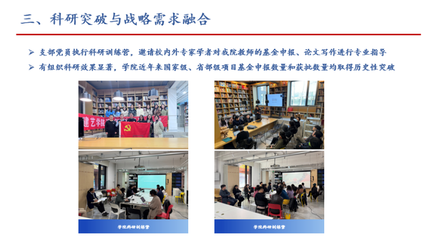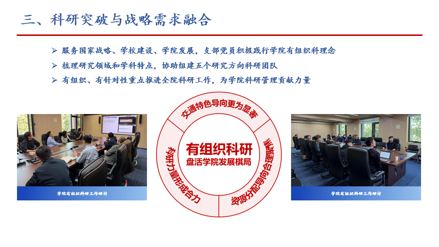 为服务国家战略,支部党员积极践行学院有组织科研理念,通过对教师研究领域和学科特点的梳理,组建五个方向的科研团队,有组织有针对性地重点推进全院科研工作,为全院教师围绕特色方向申报科研项目、寻求科研实践机会、加强学院科研管理贡献力量。