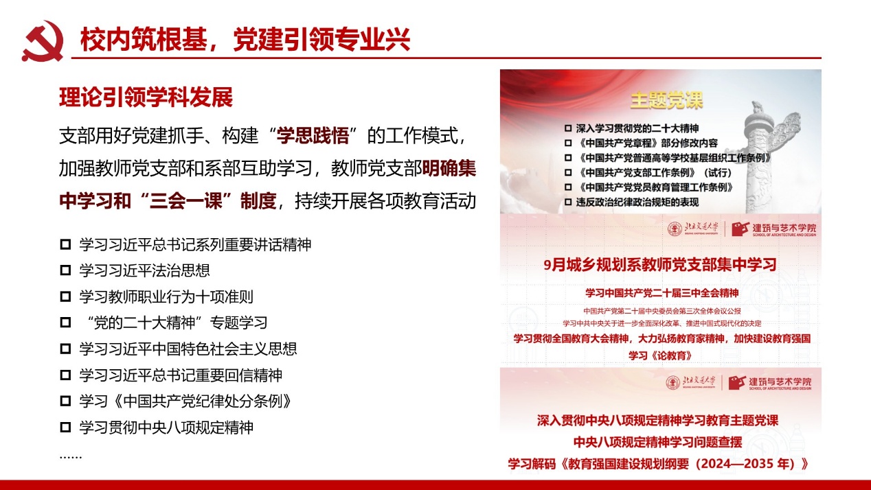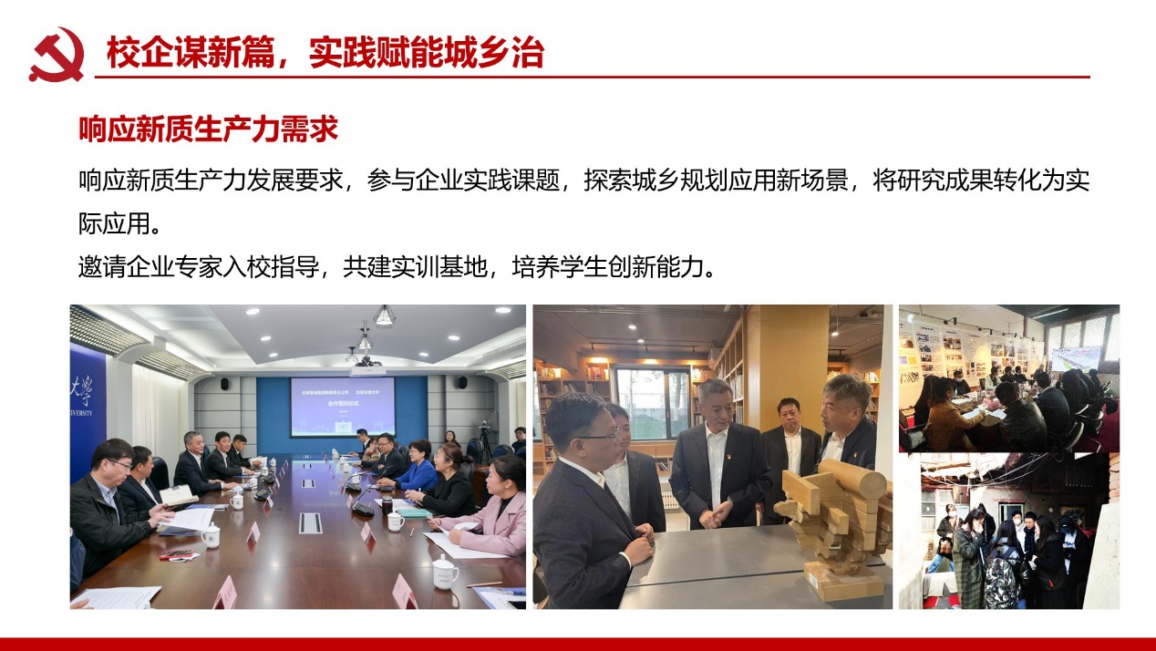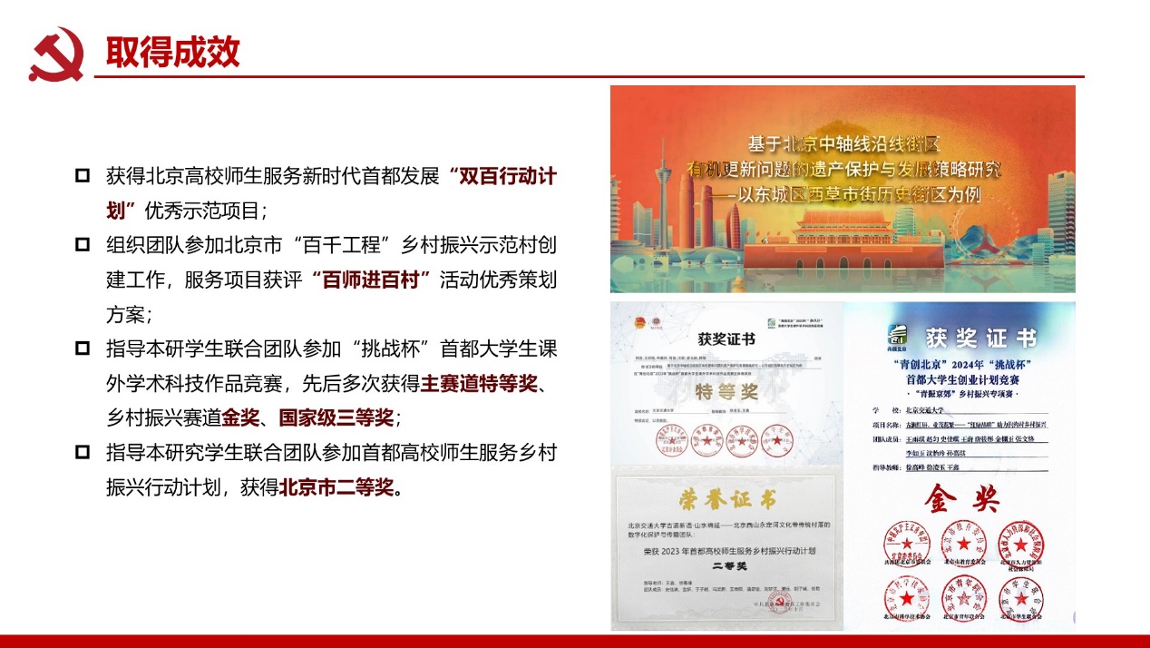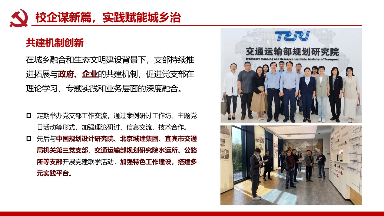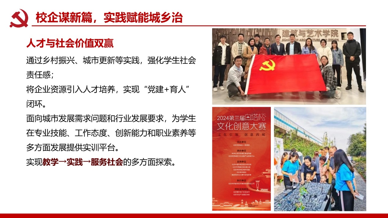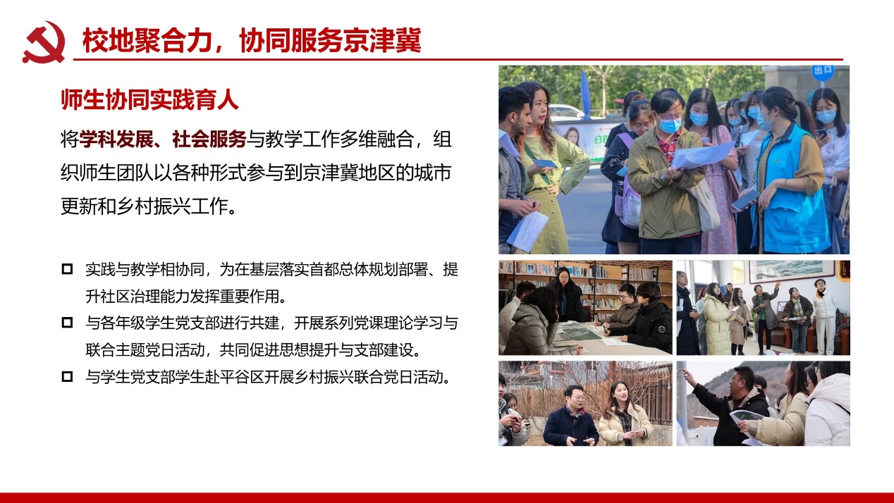 支部建成校级“双带头人”党支部书记工作室;党员教师屡获北京市责任规划师表彰,服务成果广受政府企业认可。构建校地校企师生三维联动机制,破解党建业务“两张皮”痼疾,深化学科服务国家战略功能。打造责任规划师、灾后重建等实践育人载体,培育兼具家国情怀与专业能力人才。深化校企党建协同加速技术转化,推动产学研用融合创新,赋能新质生产力发展支撑。