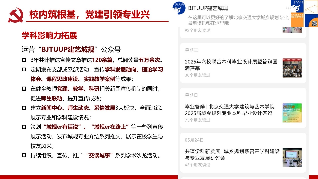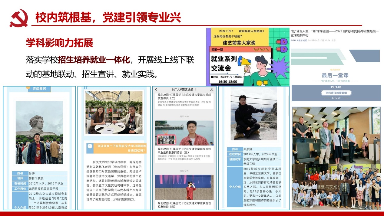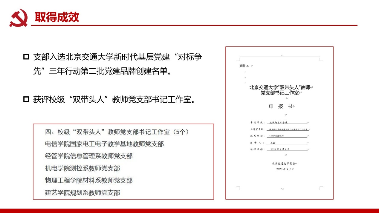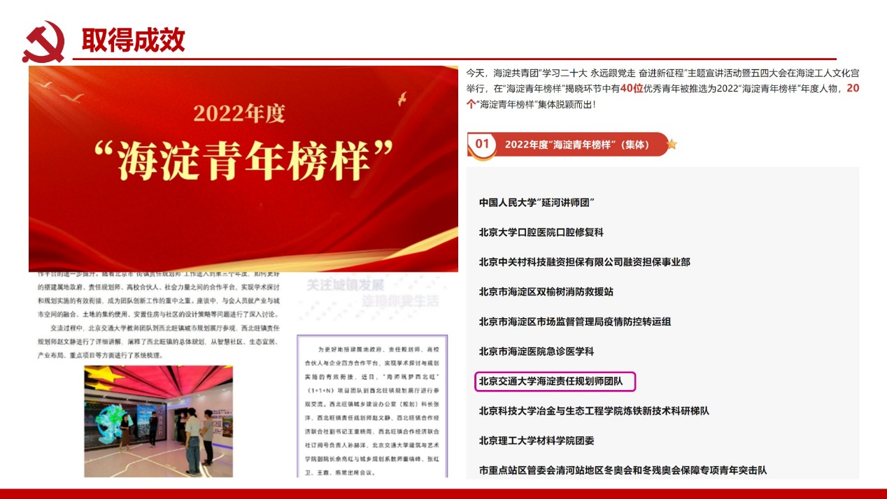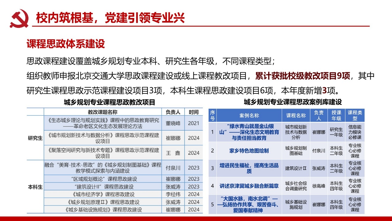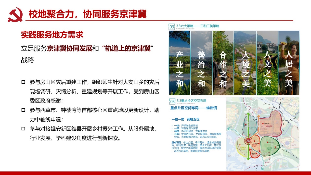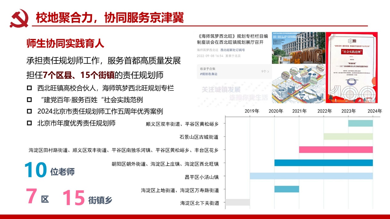 支部建成校级“双带头人”党支部书记工作室;党员教师屡获北京市责任规划师表彰,服务成果广受政府企业认可。构建校地校企师生三维联动机制,破解党建业务“两张皮”痼疾,深化学科服务国家战略功能。打造责任规划师、灾后重建等实践育人载体,培育兼具家国情怀与专业能力人才。深化校企党建协同加速技术转化,推动产学研用融合创新,赋能新质生产力发展支撑。