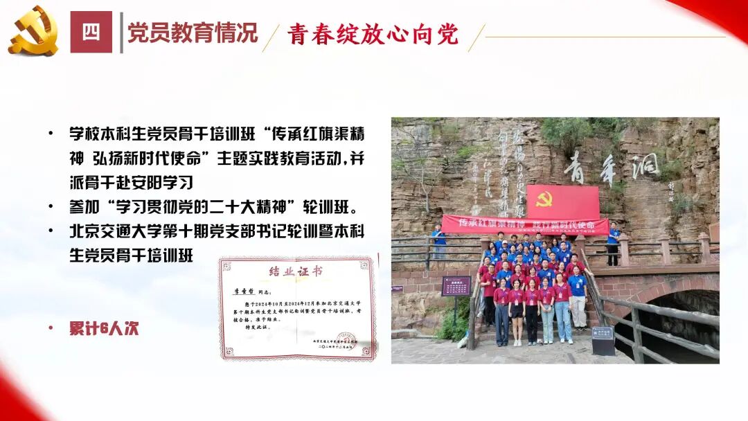 2024年,我支部党员75%在校院两级学生组织担任学生干部、79%的党员学习成绩居所在专业的前40%;党员中92%获得至少一项以上的校级以上荣誉,充分发挥党员先锋模范带头作用。