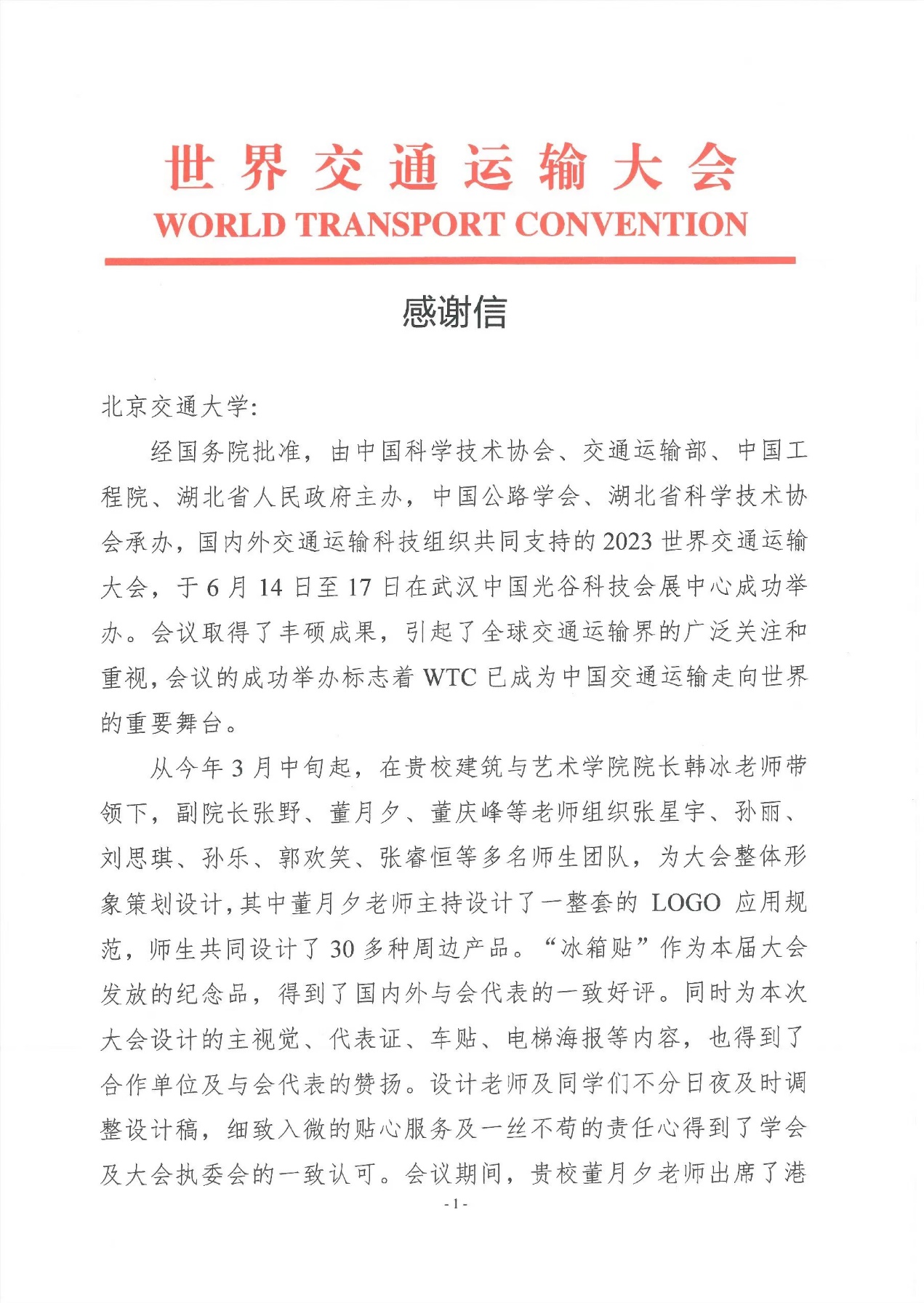 世界交通运输大会执委会在感谢信中提到,今年3月中旬开始,在哔咔漫画 院长韩冰带领下,副院长张野、董月夕、董庆峰等老师组织多名师生团队,为大会整体形象策划设计,其中董月夕老师主持设计了一整套的LOGO应用规范,师生共同设计了30多种周边产品,为本次大会设计的主视觉、纪念品、代表证、车贴、电梯海报等内容,得到了国内外与会代表的一致好评,展现出学院师生极高的专业素养和责任心。