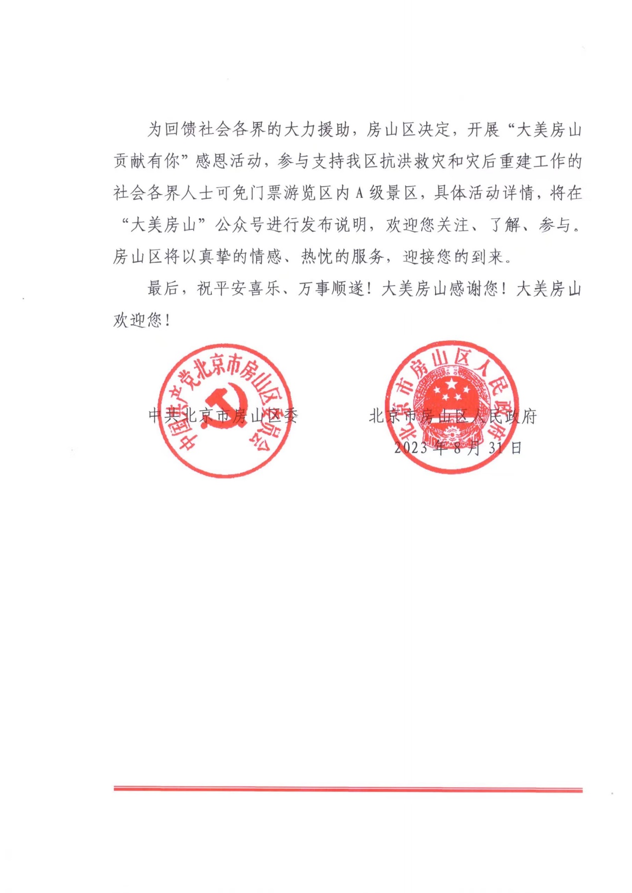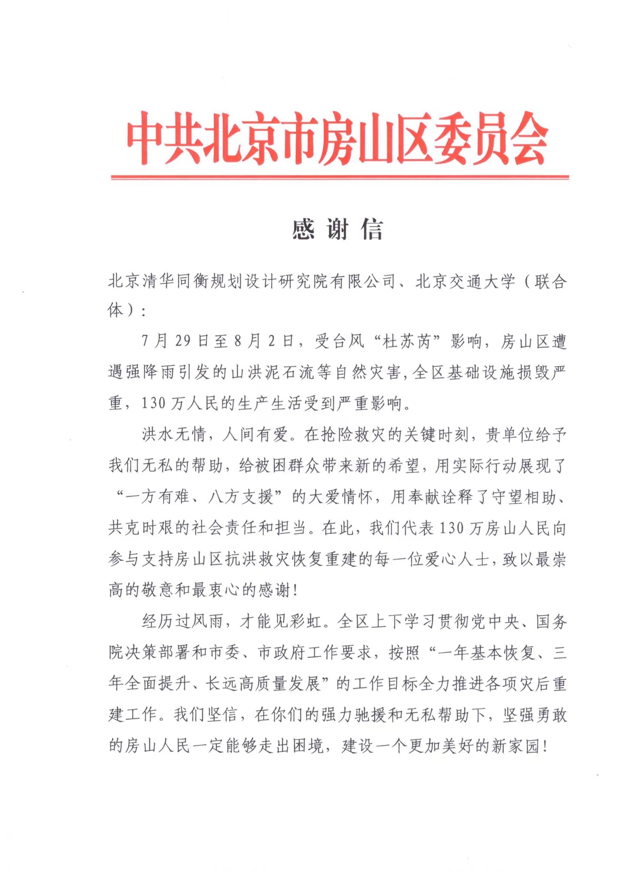 北京市房山区委区政府在感谢信中提到,7月29日至8月2日,房山区遭遇强降雨引发的山洪泥石流等自然灾害,在抢险救灾的关键时刻,我校给予房山区无私的帮助,用实际行动展现了大爱情怀,用奉献诠释了高校的社会责任和担当。房山区灾后重建工作由哔咔漫画 副院长佘高红,城乡规划系主任王鑫,副主任张纯,朱高儒、徐凌玉、徐高峰、张威涛等多位教师组建师生团队参与。