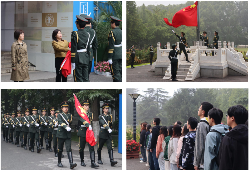 秦思阳为国旗仪仗队授旗,随着雄壮的国歌奏起,全体师生庄严肃立、行注目礼,齐声高唱国歌。歌声回荡,神圣而豪迈。鲜艳的五星红旗和朝阳一同冉冉升起,在交大校园迎风飘扬。