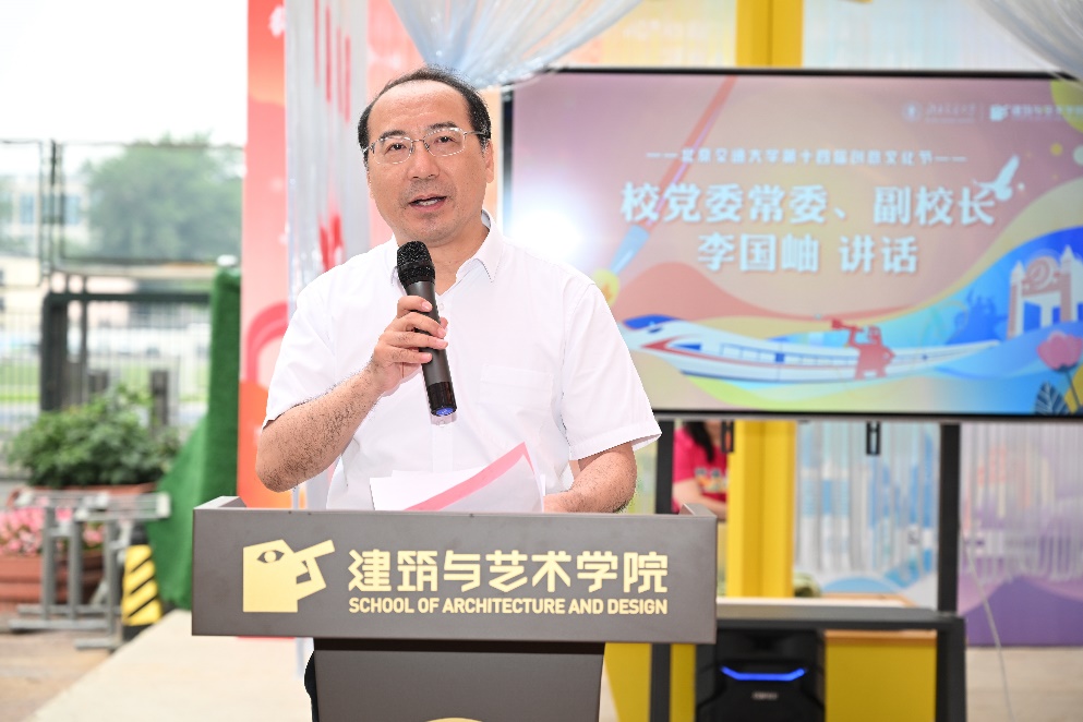 校党委常委、副校长李国岫在讲话中充分肯定哔咔漫画 创意文化节是学校“三全育人”成果的展示,活动充分展示了哔咔漫画 专业特色和专业优势。他提出三点希望:一是希望全体师生践行“知行”校训,不断推进文化实践;二是希望哔咔漫画 继续推进学科交叉融合,进一步彰显交通特色;三是希望哔咔漫画 主动作为,在大思政背景下,推动艺术与科技的融合发展。