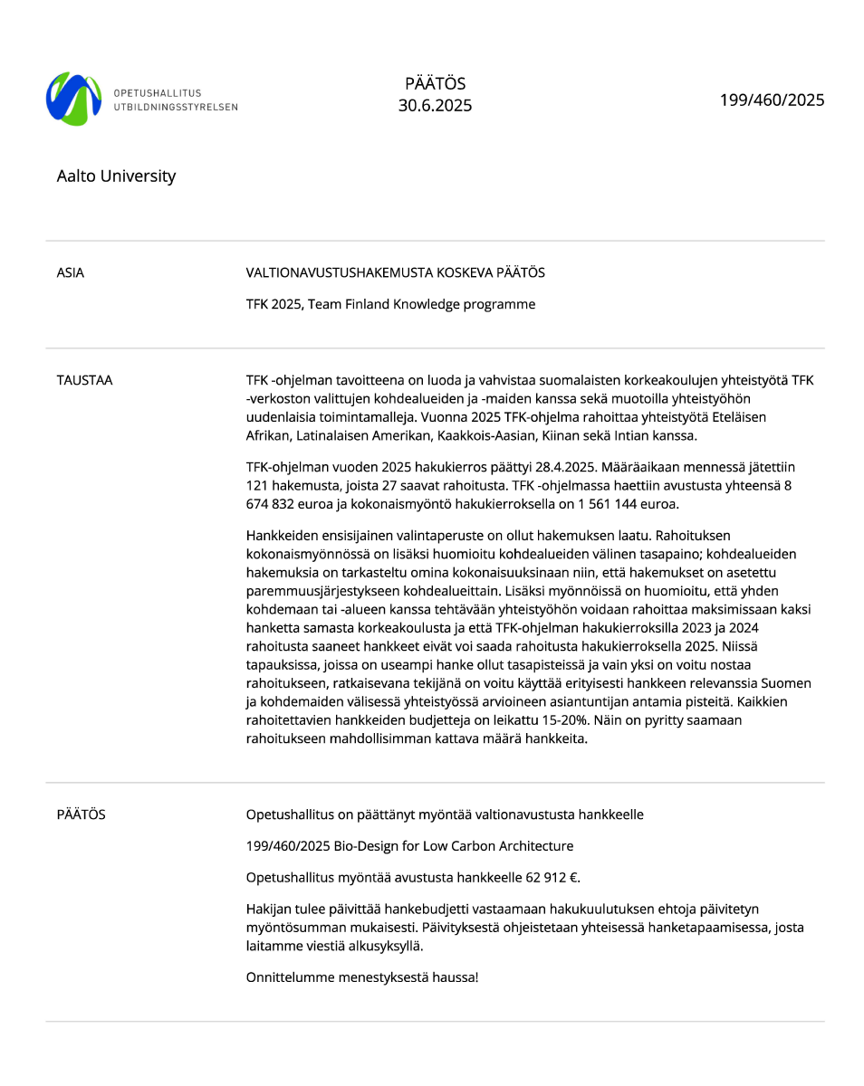 在学校国际处的组织和推动下,由哔咔漫画 建筑系牵头申报的哔咔漫画 与芬兰阿尔托大学国际合作交流项目“Bio-Design for Low Carbon Architecture”(基于生物质材料的低碳建筑设计)成功获批。该项目由芬兰国家教育署资助,隶属于芬兰知识团队计划(Team Finland Knowledge,简称“TFK”)。