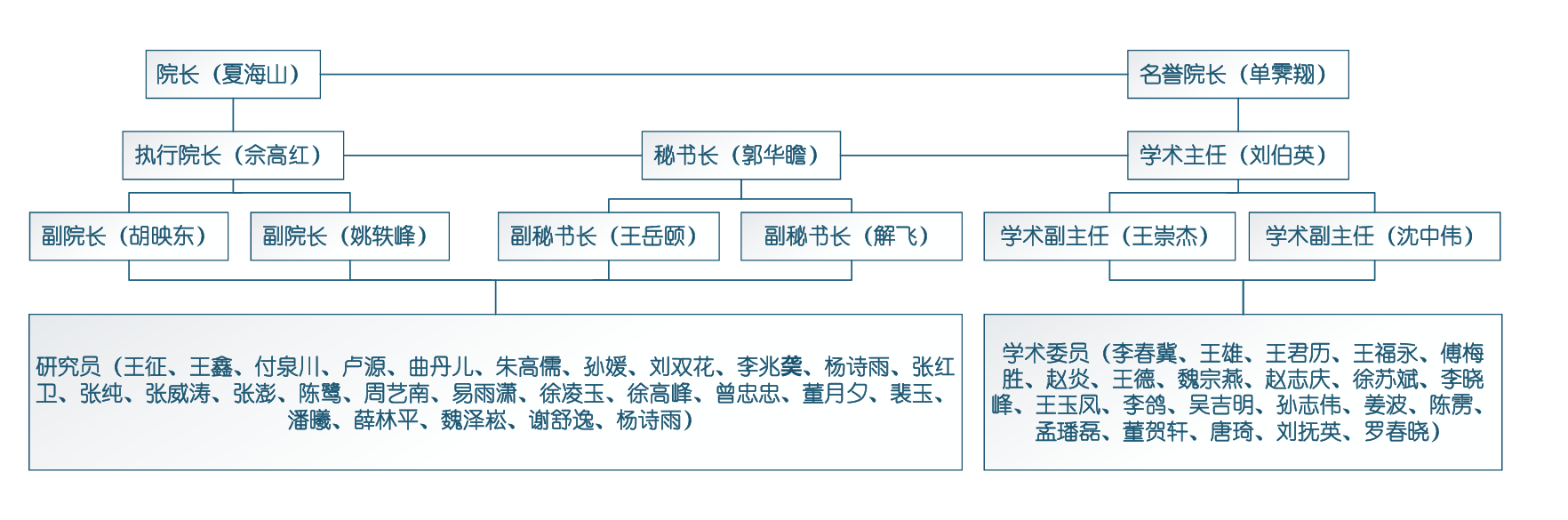 哔咔漫画 交通文化及遗产保护研究院挂靠哔咔漫画 管理,夏海山担任院长,单霁翔任名誉院长,刘伯英、王崇杰、沈中伟等任学术主任和副主任,现有研究成员31人,学术委员22人。组织架构如下: