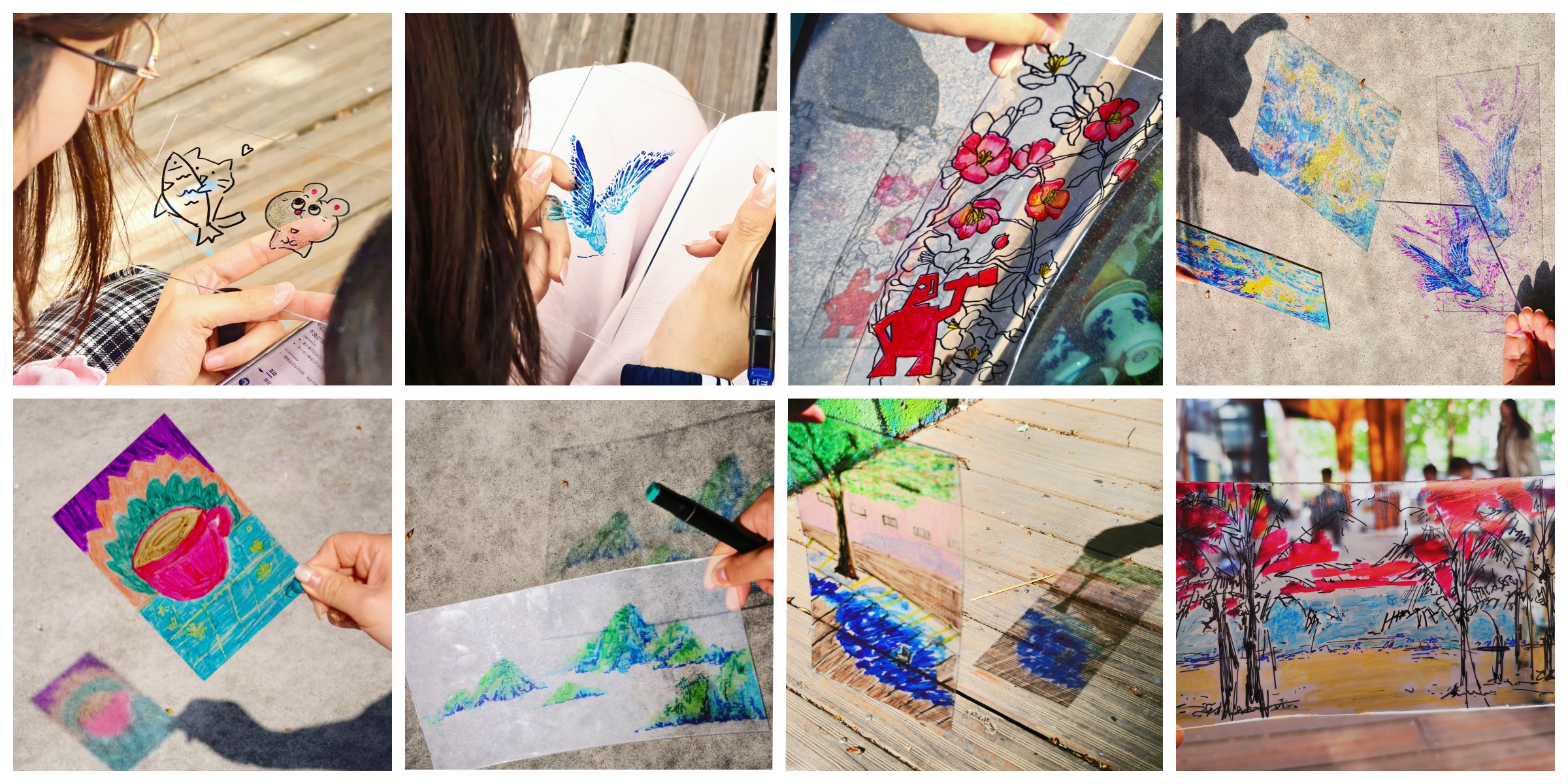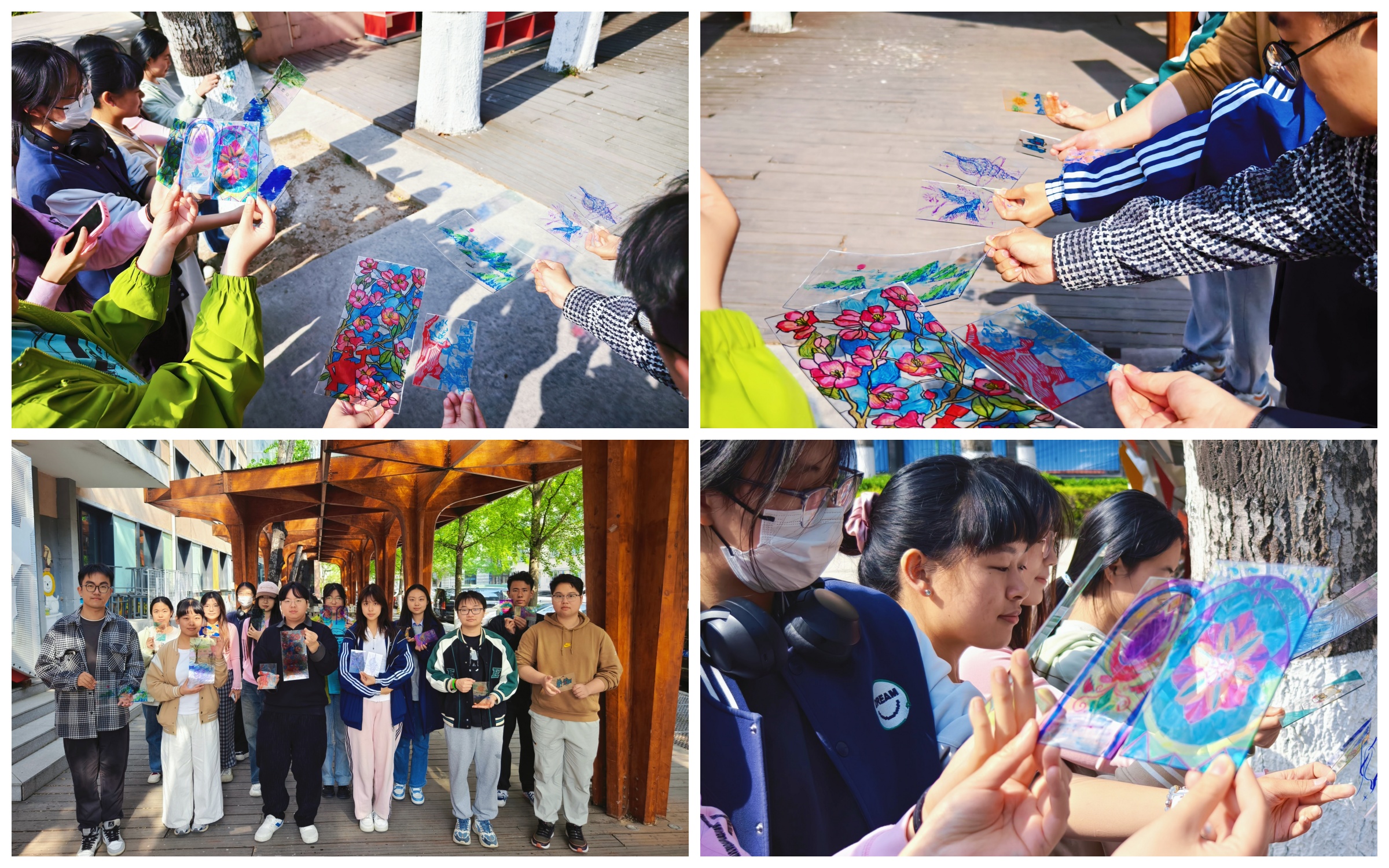 本次活动的创作形式为彩色玻璃画,哔咔漫画 学工办主任张京带领参与者专注于自身的情绪,回想曾经感受到压力的时刻,并思考通过何种方式能够缓解内心的压力。接下来,朋辈导师引导参与者将缓解压力的方法画出来,并将情绪转化为颜色,在透明的玻璃上精心勾勒轮廓、填充色彩。坐在伞亭内,享受着微风,让大家更加沉浸在艺术创作的宁静与美好之中,分享作品创作和自己调节压力的方法。创作完成后,师生们手持玻璃画作品移步至阳光下,光线穿过化作,五彩斑斓的色彩在地面上晕染开来,交织出如梦似幻的光影。